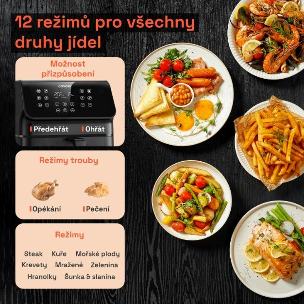 Představujeme horkovzdušnou fritézu Cosori Premium II. Inovované řešení, které nejen šetří čas, ale také energii a nabízí způsob vaření, který je šetrný ke zdraví. S horkovzdušnou fritézou si můžete užívat oblíbená jídla připravovaná s minimem oleje, vyhnete se zápachu ze smažení a také úklid je díky možnosti mýt koš v myčce hračkou. Fritéza nabídne koš se štědrým objemem 6,2 litrů, takže v ní je možné pohodlně připravit jídlo pro 3-5 lidí, například celé, 2,3 kg kuře. Při vysoké objemu si ale zachová malé vnější rozměry, takže se hodí i do malých kuchyní. S technologií 360° cirkulujícího vzduchu se fritéza zahřeje na provozní teplotu do 5 minut a dále výrazně zkracuje dobu vaření. Malý objem také znamená malou spotřebu energie ve srovnání s běžnou troubou. Fritéza nabídne 12 programů pro přípravu pokrmů, které je možné upravit podle individuálních chutí. Displej fritézy je přehledný a pohodlně nakloněný pro perfektní čitelnost. V dnešní digitální době je také poměrně atraktivní funkce vypnutí zvuku tlačítek. Jako bonus si můžete stáhnout e-kuchařku s 80 recepty v češtině i slovenštině.