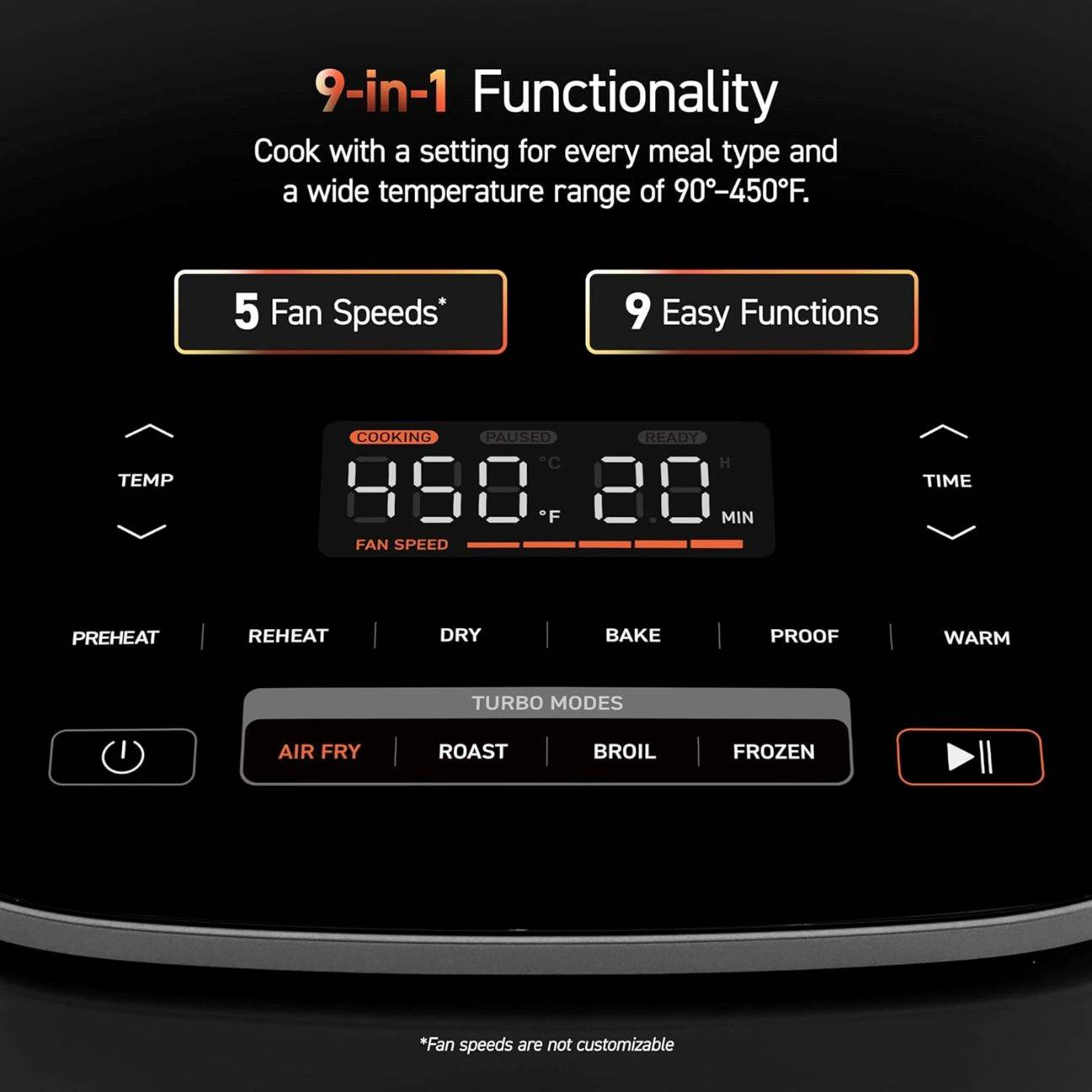 • 9 funkcí: fritování, pečení masa, sladké pečení, grilování, sušení ovoce nebo zeleniny, příprava mražených potravin, ohřívání, kynutí, předehřev a udržování teploty5 rychlostí ventilátoru zaručuje dokonalé jídlo bez nutnosti míchaní při vaření