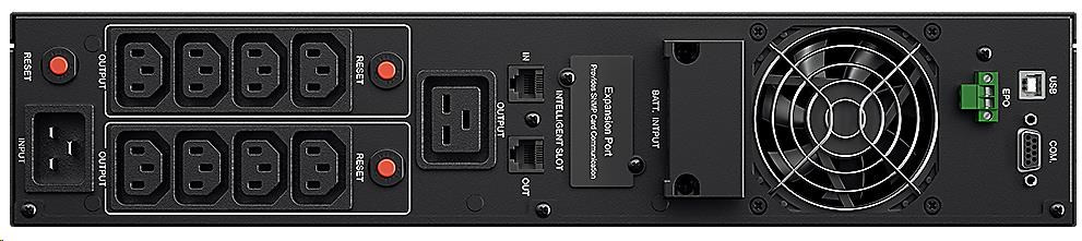 | Dodávka obsahuje | UPS, Uživatelský manuál, Rackmount lišty, Rackmount úchyty, Propojovací kabel (2), Telefoní kabel, USB kabel, Seriový kabel (RS232), M5X8L (8), M5X12L (12), Plastové podložky (8) Záslepka (12), PowerPanel® Business Edition software CD. Gumové podložky pod UPS(12) |