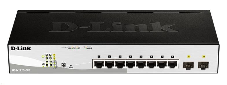 D-Link DGS-1210-08P 10-port Gigabit Smart PoE Switch, 8x GbE PoE+, 2x SFP, PoE 65W, fanless