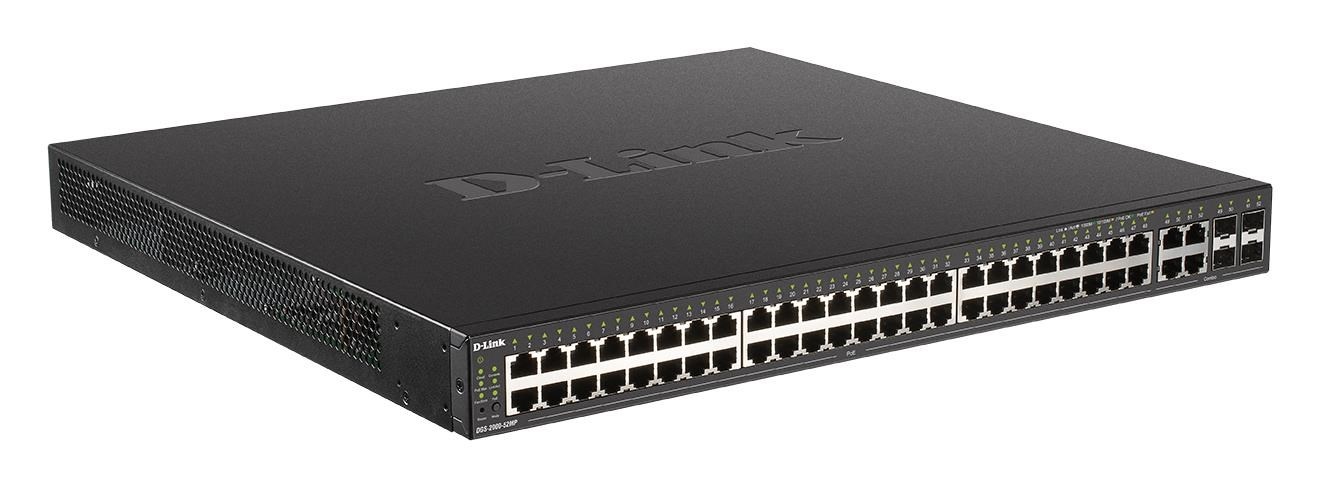 D-Link DGS-2000-52MP je plně řízený 52-portový Gigabit Managed PoE switch pro podnikové sítě. Přepínač je osazen 48 porty 10/100/1000M RJ-45 s podporou napájení 802.3at PoE+ (max. 30W na port) a čtyřmi kombinovanými Gigabit Combo porty RJ-45/SFP, s podporou 100M a 1000M SFP (Mini-GBIC) transceiverů pro optický uplink. Celkový PoE výkon přepínače je 370W. Aktivní chlazení přepínače zajišťují tři inteligentně řízené ventilátory. Součástí dodávky jsou držáky pro montáž do 19“ rozvaděče. Switche D-Link řady DGS-2000 nabízí komplexní sadu L2 funkcí, bezpečnostní funkce, funkce kvality služeb (QoS) a základní L3 funkce (max. 4 IP Interfaces, statický routing s max. 128 IPv4/IPv6 záznamy, default route, IPv6 Neighbor Discovery). Řešení případných potíží v sítí usnadňují funkce 802.3ah OAM, diagnostika kabelů a detekce jednosměrné linky (D-Link Unidirectional Link Detection, DULD). ISP poskytovatelé internetu ocení funkce Q-in-Q (Port Based), Multicast VLAN (ISM VLAN) nebo IGMP Authentication / Filtering pro efektivní provoz IPTV služeb. Správa přepínače je přes webové rozhraní, CLI sériovou konzoli, Telnet, SLL, SSH nebo pomocí SNMP příkazů. Pro prvotní konfiguraci a základní správu je k dispozici bezplatný SW nástroj a mobilní aplikace D-Link Network Assistant (DNA), pro centrální správu rozsáhlejších sítí je určena pokročilá platforma D-View 7..