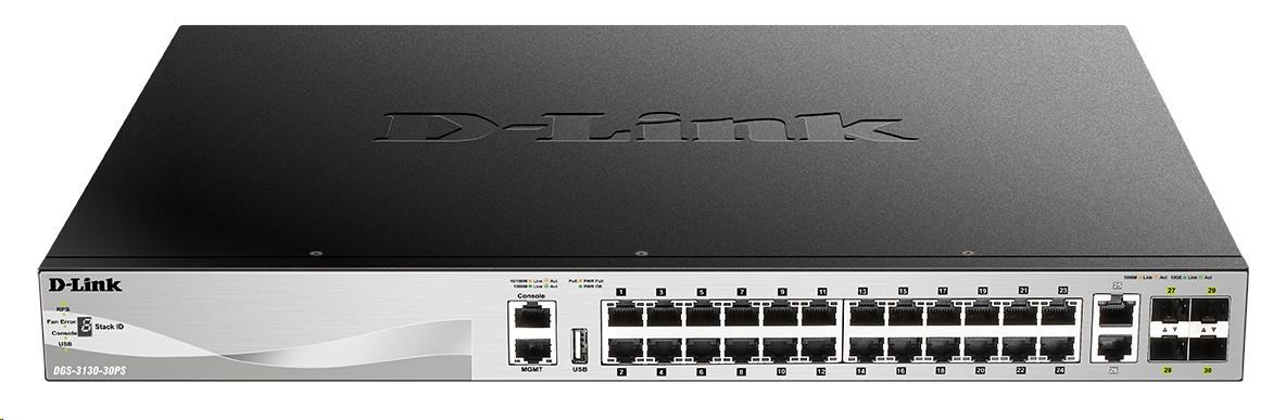 D-Link DGS-3130-30PS/E L3 Stackable Managed Gigabit PoE Switch, 24x PoE gigabit, 2x 10GBASE-T, 4x SFP+, 370W PoE