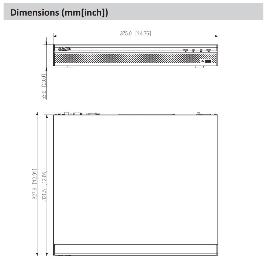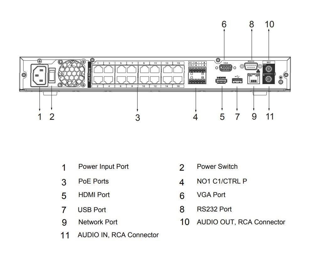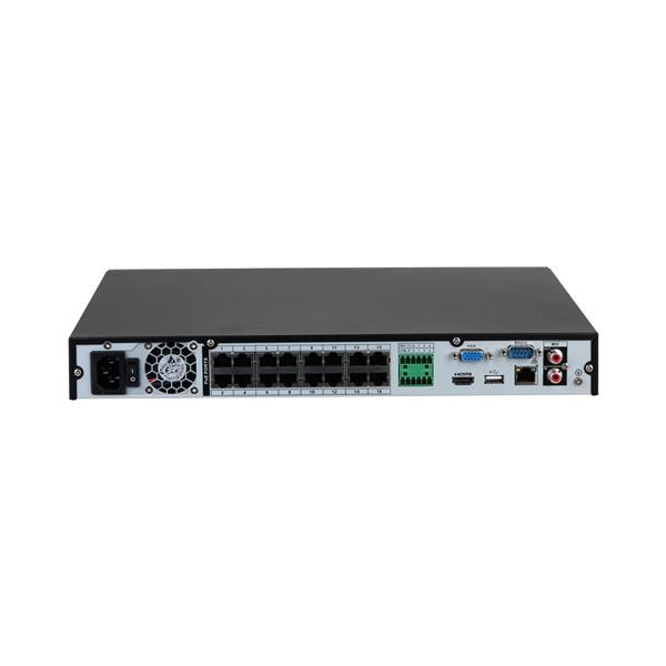 1× 10/100/1000 MbE RJ-45, 16× 10/100 Mbps RJ-45 PoE (IEEE 802.3 af/at), 1× audio vstup (RCA), 1× audio výstup (RCA), 4× alarm vstup, 2× alarm výstup, 2× USB 2.0, pozice pro 2× SATA HDD (max. 20 TB/disk), 1× HDMI, 1× VGA, 1× RS-232.