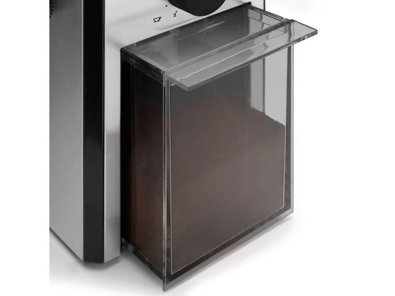 Pro ještě větší uživatelský komfort si lze nastavit požadovanou hrubost mletí nebo množství namletých zrn v závislosti na počtu požadovaných šálků. Najednou máte možnost namlít zrna až pro 12 šálků, což oceníte i v případě, že se chystáte pohostit vzácnou návštěvu. Nádobku s mletou kávou lze jednoduše vyjmout, aby nehrozilo, že při manipulaci kávu rozsypete. O stabilitu zařízení se starají protiskluzové gumové nožky. V době nepoužívání lze kabel smotat přímo do přístroje, aby vám nepřekážel na kuchyňské lince.