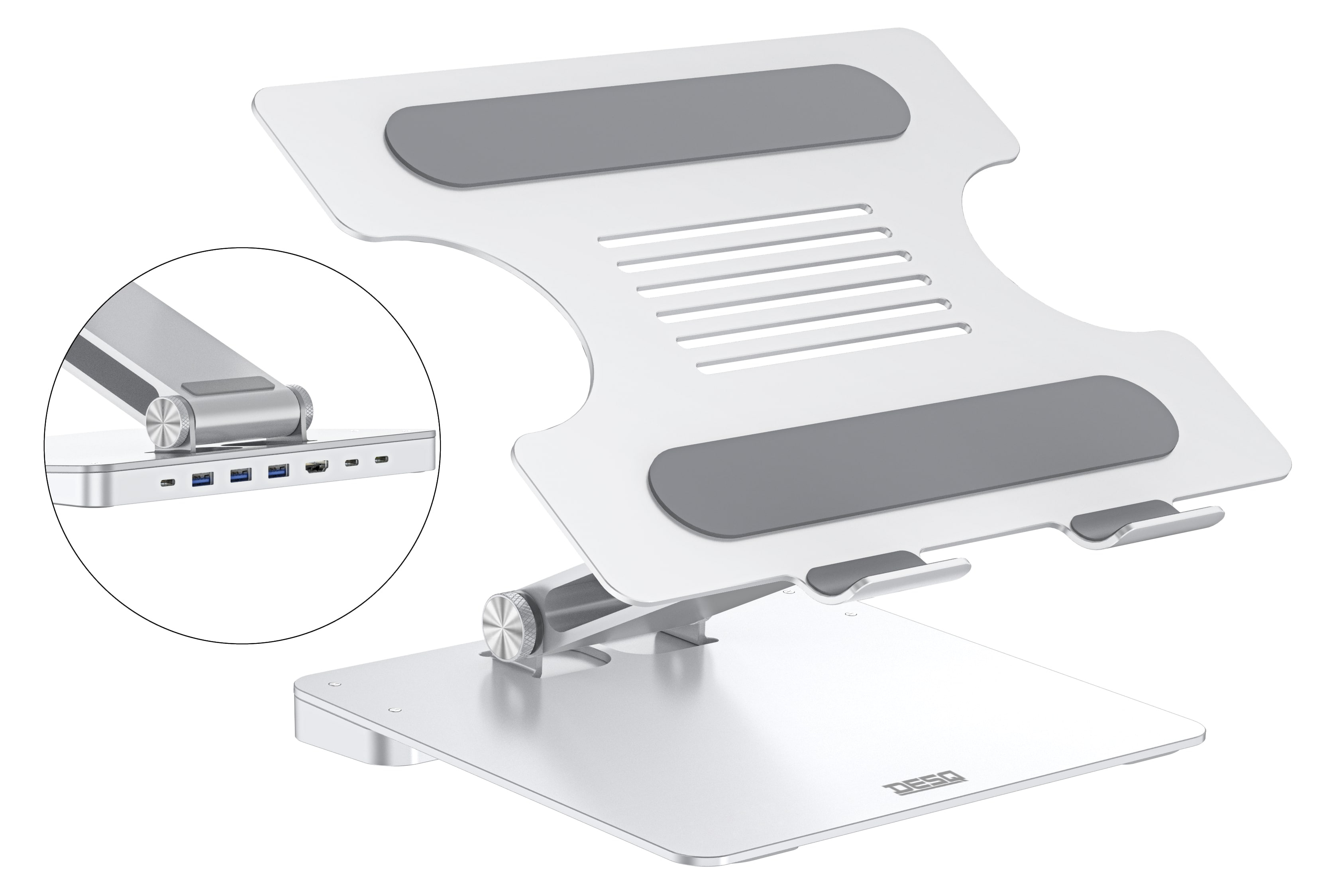 Proměňte svůj notebook v výkonnou desktopovou pracovní stanici s DESQ Notebook Dockem. Stačí připojit USB-C kabel a získáte přístup k externím monitorům, klávesnicím, myším a dalším periferiím. Stojan je kompatibilní s MacBooky, notebooky s USB Type-C, tablety a mobilními telefony. ? Promění váš notebook v desktop PC s plynulou integrací přes USB-C ? Plně nastavitelný pro ergonomickou výšku a úhly ? Zvedá obrazovku až o 28 cm pro lepší komfort při sledování ? Platforma nastavitelná až do úhlu 70 ° pro dokonalou polohu obrazovky ? Lehká konstrukce a skládací design pro snadné přenášení ? Výřezy v konstrukci podporují proudění vzduchu a udržují notebook v chladu ? Pevná a odolná hliníková slitina pro dlouhou životnost ? Silikonové podložky a nožky pro stabilitu a ochranu proti skluzu S DESQ stojanem na notebook nastavíte obrazovku do ideální výšky, což podporuje zdravé a ergonomické držení těla a pomáhá předcházet bolesti zad, krku a únavě očí..