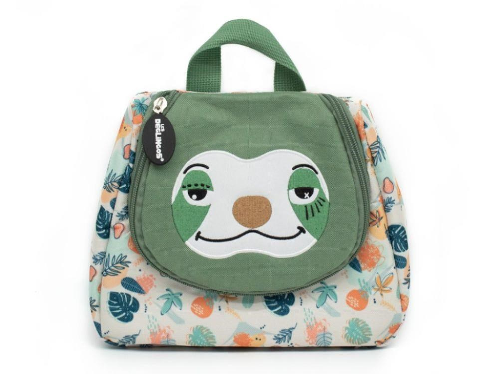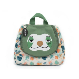 Kosmetická taška na zavěšení, v neutrální zelené barvě, s roztomilým lenochodem, je originální dětskou toaletní taškou na cesty. Velice pevná a odolná kosmetická taška, se spoustou kapsiček a odnímatelným zrcátkem, v pohodě pojme hygienické potřeby vaší holčičky nebo chlapce. Vodoodpudivý materiál umožní dětem používat tašku v koupelně i ve sprše. Díky háčku tašku jednoduše zavěsíte na háček nebo vodovodní baterii a děti mají své toaletní potřeby pohodlně po ruce..