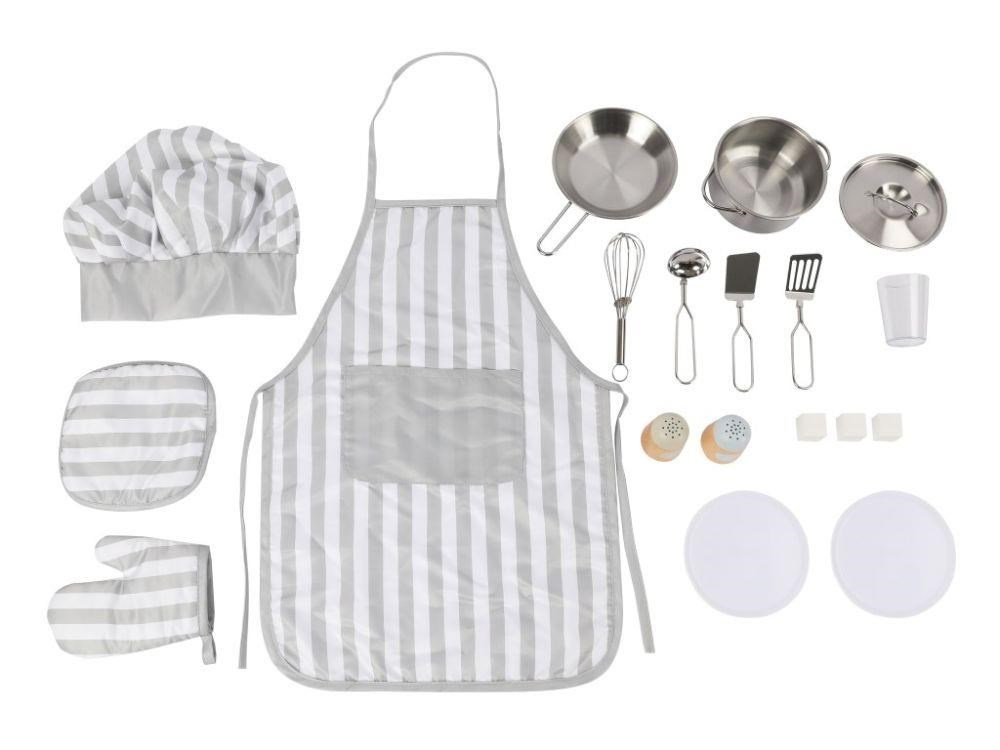 Dětská kuchařská sada s nádobím, kuchyňským náčiním a 4dílným textilním setem nadchne každého malého kuchtíka, malou hospodyňku. Se zástěrou, čepicí a ostatními doplňky se každé dítě promění v opravdového kuchaře, ať už ve své vlastní dětské kuchyňce nebo v kuchyni opravdové. Hra s nádobím a textilním kuchařským setem zdokonaluje dětské dovednosti, rozvíjí fantazii a kreativitu, děti hrají role, napodobují profese a rodiče..