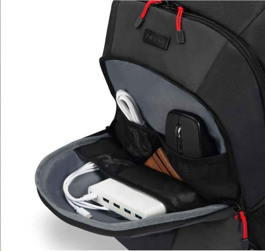 Skrytá kapsa na zadní straně slouží jako bezpečnostní kapsa a poutko na kolečkách