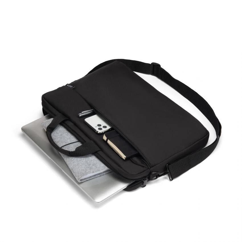 Upevňovací pásek zajišťuje bezpečné uchycení bez vyklouznutí. Dokumenty a mobilní příslušenství, jako jsou chytré telefony, vizitky, pera atd. jsou vždy po ruce v přední přihrádce na zip. Pohodlné nošení zajišťuje délkově nastavitelný a odnímatelný ramenní popruh a rukojeť. DICOTA zdůrazňuje odolnost rodiny ONE prodlouženou pětiletou zárukou.