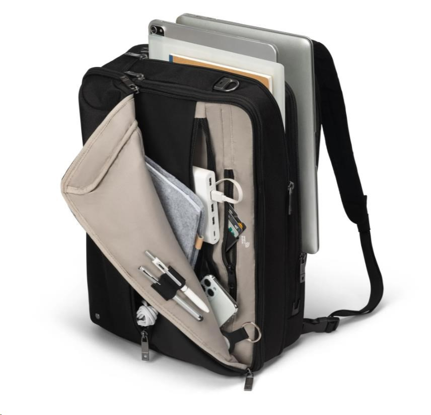 Flexibilita se setkává s bezpečností v tašce Top Traveller DUAL FIVE, konvertibilní pracovní tašce, která se plynule promění z elegantní aktovky v praktický batoh. Je vybavena ochranou DCT Notebook Protection a uzamykatelnou přihrádkou, takže váš notebook zůstane v bezpečí, zatímco skryté popruhy batohu umožňují snadné přepínání mezi různými způsoby nošení. Hlavní přihrádka nabízí prostor pro tablety, dokumenty a mobilní vybavení, zatímco přední část obsahuje strukturované kapsy na příslušenství a samostatnou malou kapsu na kabely a nezbytnosti. Navíc s 35,5% recyklovanými PET lahvemi použitými při výrobě je to chytrá a ekologická volba.