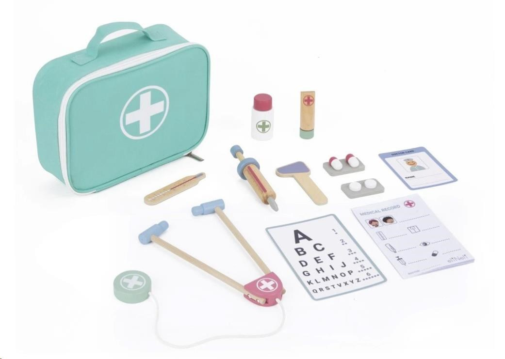 Doktorské vybavení v praktické brašně umožní dětem vyšetřovat pacienty v podobě plyšových hraček, panenek, kamarádů nebo rodičů, stanovit diagnózu a zahájit léčbu. Součástí dětského doktorského setu je základní lékařské vybavení včetně oční tabulky pro vyšetření zraku.