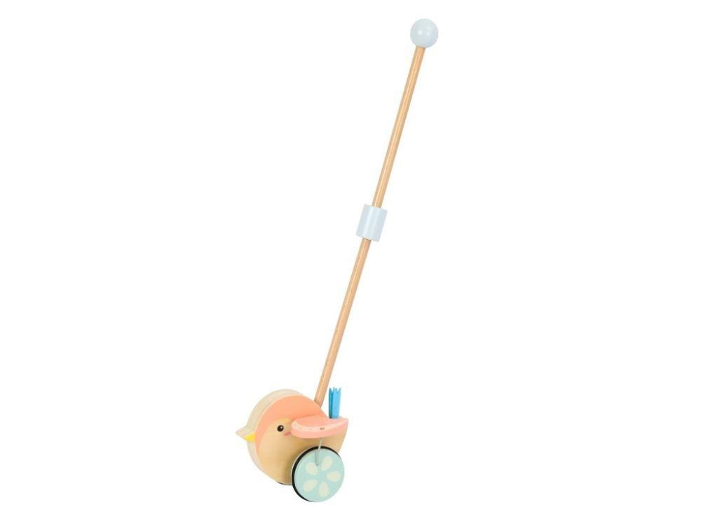 Dřevěná tahací hračka (strkadlo) v podobě barevného ptáčka motivuje děti k pohybu a tím zdokonaluje jejich motorické dovednosti. Zvědavému ptáčku mohou děti ukázat svůj pokojíček, celý dům nebo byt a on je bude věrně následovat na každém kroku. Pro ještě více zábavy a radosti z pohybuje bude ptáček při strkání nebo tahání vesele třepotat křidýlky..