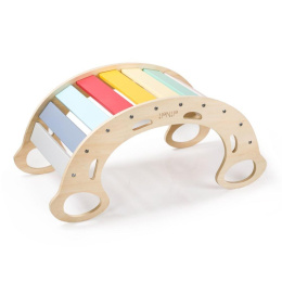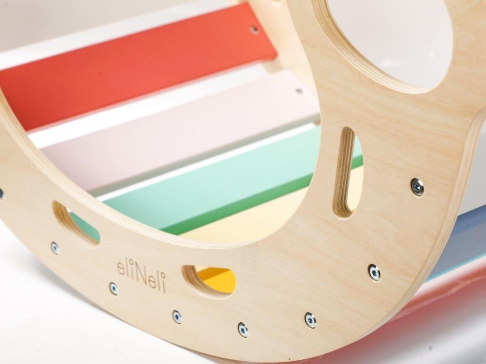 Vylepšená multifunkční dřevěná houpačka 5v1, s deskami ve svěžích fresh barvách, je zábavnou hračkou pro děti, kterou využijí při pohybových aktivitách i při hře. Montessori houpačka umožní dětem příjemně se pohoupat, skvěle poslouží jako prolézačka, skluzavka, skrýš, most, stolička nebo prodejní pultík při hře na obchod. Houpačka přirozeným způsobem rozvíjí motorické dovednosti a je vhodná pro děti již od 1 roku..
