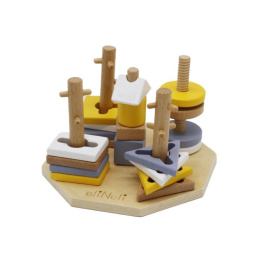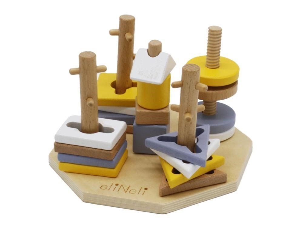 Úžasná motorická hračka, dřevěná navlékací hra s geometrickými tvary, přirozeným způsobem rozvíjí u děti motorické dovednosti, koordinaci očí a rukou, představivost, učí dětí soustředit se. Navlékací tvary v krásných neutrálních barvách děti nasazují na dřevěné kolíky, které však nejsou zcela hladké a dětem navlékání ztěžují různými výstupky. Někdy tato hra vyžaduje spoustu trpělivosti..