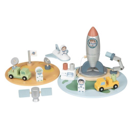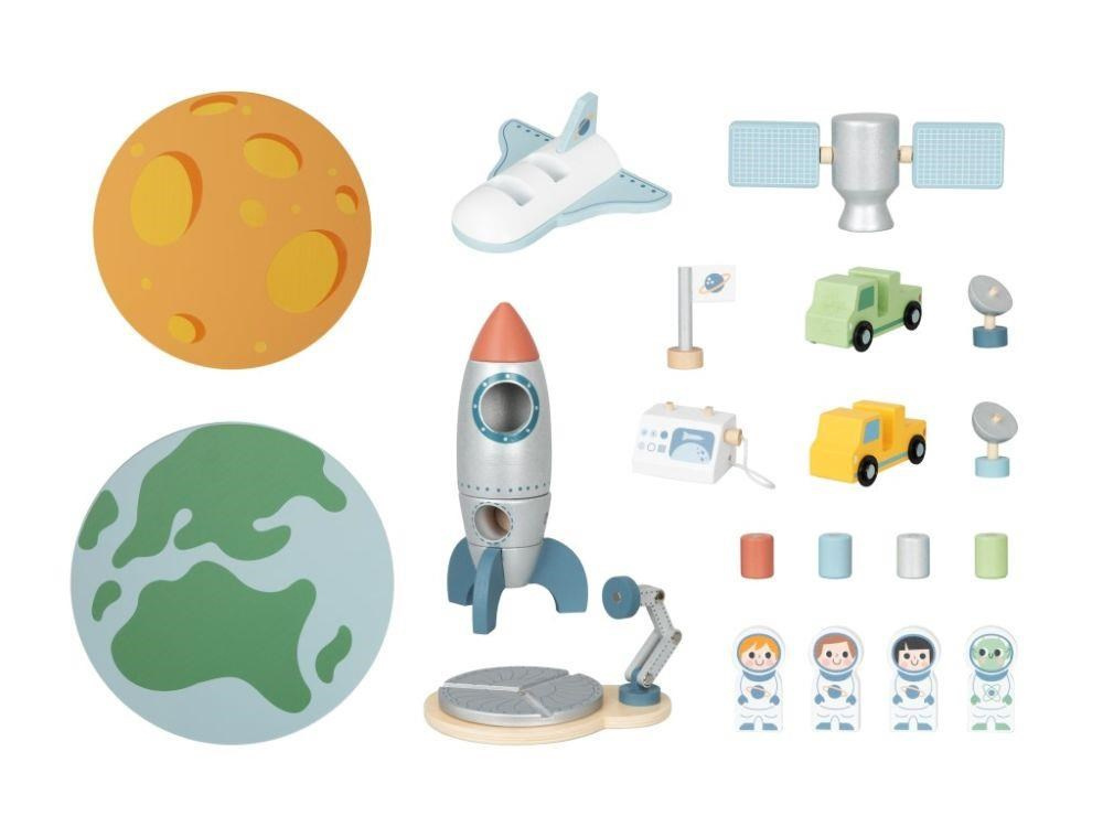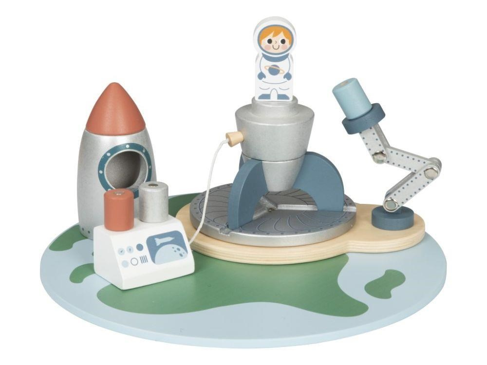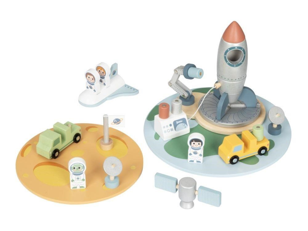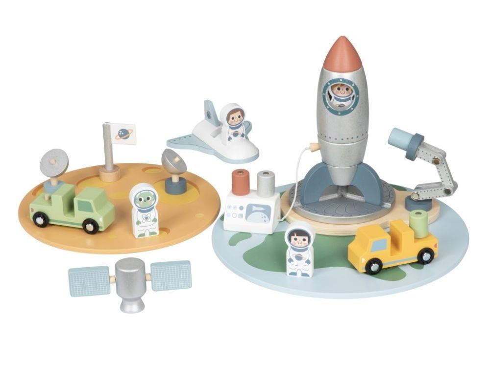 Dřevěná vesmírná základna se spoustou dřevěných prvků zavede děti do vesmíru. Hračka umožňuje dětem rozložit si základnu na Zemi i ve vesmíru, naplánovat start raketoplánu i vesmírnou misi na právě objevené planetě. Součástí balení jsou různé dopravní prostředky, satelity a astronauti..