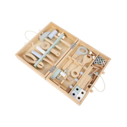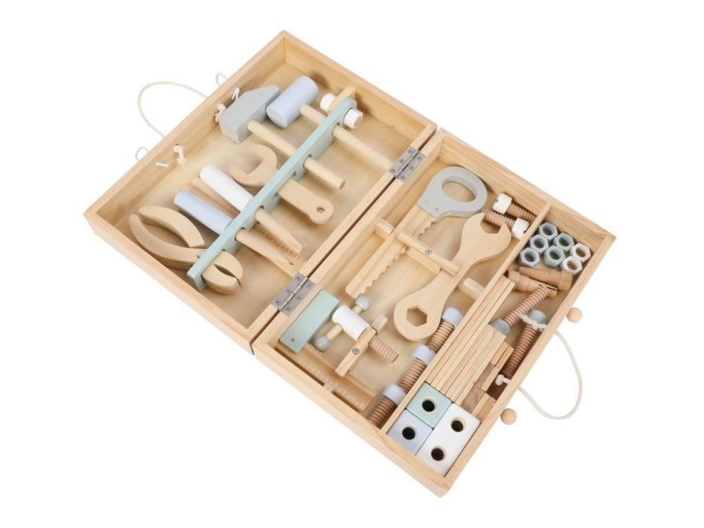 Dřevěné nářadí krásně a přehledně uložené v praktickém dřevěném kufříku nadchne každého malé kutila. Uvnitř kufříku najdou děti nejdůležitější nástroje včetně šroubů, matek a dalších doplňků. Kufřík s poutkem a členěným vnitřním prostorem usnadní dětem úklid i přenášení oblíbené hračky, děti tak mohou mít svou opravářskou a kutilskou sadu stále s sebou, na dovolené, na víkend k babičce..