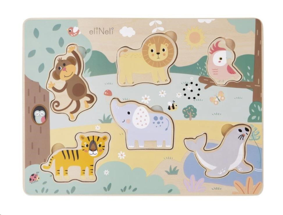 Zvukové vkládací puzzle s oblíbenými zvířátky - lvem, tygrem, slonem, lachtanem, opičkou a papouškem, zavede děti do ZOO. S dřevěnými puzzle dílky v podobě zvířátek děti potrénují motorické dovednosti, koordinaci očí, logické myšlení, stimulují smysly, naučí se trpělivosti, soustředit se a ještě si užijí spoustu zábavy.