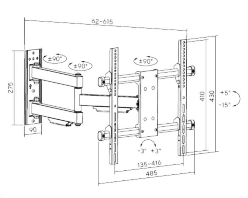 Otočný sklopný výsuvný držák Tv Fiber Mounts RAPTOR Kvalitní držák Tv 43" - 60", vzdálenost od zdi 62 - 615mm, otočný až +90° / -90°, naklápění +5° / -15°, kvalitní pevná konstrukce, úchytky na kabeláž, instalační materiál, VESA 200x100 až 400x400, nosnost 50kg, záruka 10 let Kvalitní nástěnný držák na televize Fiber Mounts RAPTOR Představujeme Fiber Mounts RAPTOR - kvalitní držák pro televizi, který promění váš obývací pokoj v dynamické multimediální centrum. S Fiber Mounts RAPTOR se každý filmový večer stane nezapomenutelným zážitkem, a každý sportovní přenos tak živým, jako byste byli přímo na stadionu. Nenechte se svazovat statickým umístěním vaší televize. Díky otočnému mechanismu +90° / -90° a naklápění +5° / -15° si můžete obrazovku nastavit přesně podle vašich potřeb. Ať už chcete sledovat oblíbený film z pohodlí gauče, křesla nebo potřebujete upravit úhel pohledu pro videohovor, Fiber Mounts RAPTOR vám to umožní s lehkostí. Navíc, s vzdáleností od zdi 62 - 615mm poskytuje Fiber Mounts RAPTOR nejen flexibilitu v umístění, ale také jednoduchý přístup k zadním portům vaší televize pro rychlé připojení nebo odpojení zařízení. A díky pevné konstrukci a nosnosti až 50kg můžete mít jistotu, že váš 43" - 60" televizor bude v bezpečí. Nezapomněli jsme ani na estetickou stránku. S úchytkami na kabeláž bude váš obývací pokoj vždy vypadat uklizeně a organizovaně, bez rušivých kabelů visících z televize. A s přiloženým instalačním materiálem a zárukou 10 let je montáž a používání Fiber Mounts RAPTOR hračka. Televizní držák kvalitní robustní konstrukce Fiber Mounts RAPTOR Technické údaje: nosnost 50kg podpora VESA standardů pro zavěšení Tv 200x100 až 600x400 ideální na televize a obrazovky s úhlopříčkou 43" až 60" nastavitelná vzdálenost od zdi 62 - 615mm otáčení obrazovky do stran až +90° / -90° naklápění +5° / -15° korekce roviny obrazovky +3° / -3° kvalitní velmi pevná konstrukce úchytky na kabeláž nástěnný úchyt o rozměrech 275 x 90mm barevné provedení černé záruka 10 let.