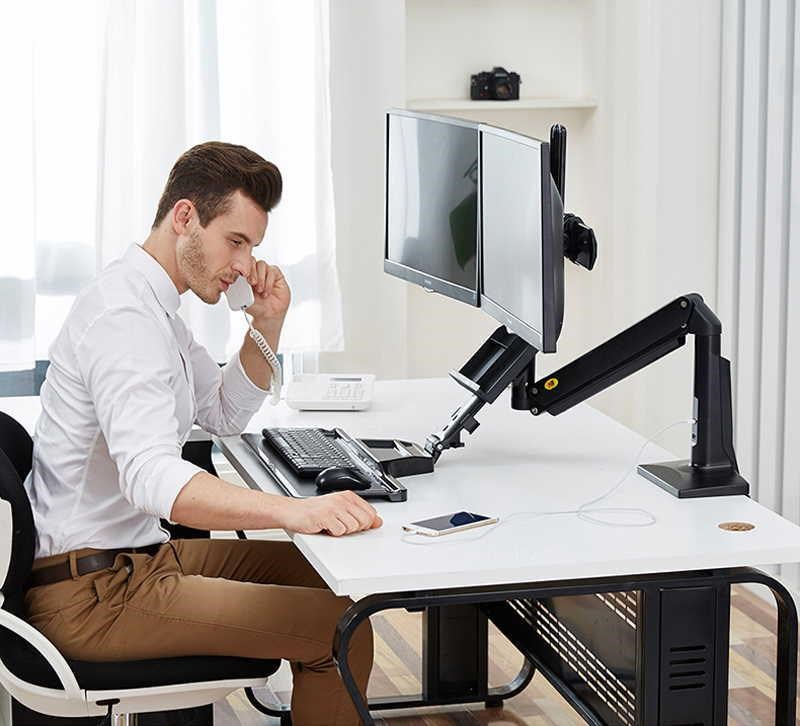 Stolní držák na 2 monitory a klávesnici NB FC24-2A-B Profesionální pracovní stanice pro dva monitory 17-27" s policí na klávesnici a myš, ergonomický držák pro rychlou změnu pro práci vsedě nebo vestoje, plná polohovatelnost, VESA 75x75 a 100x100, plynová pružina, nosnost 15kg Profesionální stolní držák na 2 monitory 17-27" s policí na klávesnici a myš, ergonomický pro práci ve stoje nebo vsedě se snadným a rychlým výškovým polohováním 480mm. Monitory lze na držáku posouvat do stran, naklápět, otočit na šířku nebo na výšku, mírně natáčet do stran, výškově polohovat. Extrémně snadné výškové polohování celého držáku díky plynové pružině, během okamžiku můžete změnit pozici vsedě na pozici vestoje a otočit držák do stran +/- 180°. Profesionální kvalita s důrazem na dizajn, 2x USB porty 3.0, systém pro vedení kabeláže, snadná instalace na stolové desky o průměru 10-95mm. Barevné provedení černé, záruka 3 roky. Pracovní stanice na 2 monitory 17-27" s policí na klávesnici a myš, ergonomický pro práci vsedě nebo vestoje NB FC24-2A Technické údaje: nosnost minimální 9kg / maximální 15 kg VESA standard 75x75 a 100x100 na monitory a displeje s úhlopříčkou 17-27" naklápění monitorů +16° / -10° nastavení výšky monitoruod police +/- 191 mm výškové polohování celého držáku +/- 480 mm maximální výška od pracovní desky 1011 mm otáčení do stran +/- 180° funkce PIVOT - otočení monitorů na šířku nebo na výšku úprava vzdálenosti police 0 ~ 60 mm rozměry police na klávesnici 560x200 mm organizátor pod obrazovkou o rozměrech 220x160 mm dva porty USB 3.0 systém vedení kabeláže ergonomický držák pro rychlé nastavení pro práci vsedě nebo vestoje uchycení na okraj stolu, stolové desky o síle 10-95mm profesionální kvalita a zpracovnání jednoduchá montáž a velmi snadné polohování barevné provedení černé záruka 3 roky Držák NB FC24-2A-B podporuje VESA standardy: VESA 75x75 VESA 100x100.