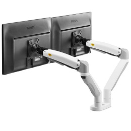 Dvoumonitorový stolní držák NB F195AW Profesionální stolní držák na 2 monitory 21-32", 3D nezávislé nastavení polohy, bílé provedení, profesionální kvalita Špičkový stolní držák pro zavěšení 2 monitorů a jejich nezávislé nastavení polohy: otáčení do stran, nastavení výšky, nastavení vzdálenosti od stolního úchytu, náklon, rotace obrazovky, korekce roviny. Různé nastavení polohy monitorů - vedle sebe na šířku, vedle sebe na výšku, pod sebou na šířku, nebo jeden monitor na šířku a druhý na výšku. Hmotnost každého monitoru musí být v rozmezí 3-9kg. Balení obsahuje 2 typy úchytů na stolovou desku, instalační materiál a návod. Barevné provedení bílé. Záruka 3 roky. Bílý držák na dva monitory, polohovatelný, profesionální kvality, záruka 3 roky - Mounts F195AWProfesionální bílý držák na 2 monitory, různé polohování monitorů, plně nastavitelný držák, TOP kvalita - Mounts F195AW Bílý držák na dva monitory, do kanceláře, pracovny, nemocnice, ordinace. Top kvalita, snadné polohování. Držák 2 monitorů Mounts F195AW Technické údaje: celková nosnost 18kg hmotnost každého monitoru musí být v rozmezí 3 ÷ 9 kg podpora VESA standardu 75x75 a 100x100 v případě potřeby za příplatek možnost rozšíření VESA na 200x100 nebo 200x200 doporučená úhlopříčka monitorů 21" až 32" nezávislé nastavení výšky: min. 220mm, max. 565mm nezávislé otáčení monitoru do stran +/- 180° nezávislé naklonění monitoru +53° až -8° nezávislá rotace monitoru - otočení monitoru na šířku nebo na výšku, korekce roviny nezávislé nastavení vzdálenosti od stolního úchytu: 0mm až 700mm uchycení na stolové desky o průměru 10mm až 90mm balení obsahuje 2 typy úchytů na stolové desky (na okraj, do prostoru) 2x USB port vynikající kvalita, krásný design snadné nastavení polohy monitorů spolehlivost, bezpečnost barevné provedení bílé, stříbrné nebo černé záruka 3 roky Mounts F195AW - bílý stolní držák pro nezávislé zavěšení a polohování dvou monitorů Dvoumonitorový stolní držák NB F195AW podporuje VESA standardy: VESA 75x75 VESA 100x100 za příplatek rozšíření na VESA 200x100 za příplatek rozšíření na VESA 200x200 Bílý držák na dva monitory Mounts F195AW Velmi pěkný bílý držák na dva monitory, nezávislé polohování každého monitoru, snadná nastavitelnost, profesionální kvalita a zpracování. Ideální držák do moderních kanceláří, ordinací, nemocnic nebo pracoven..