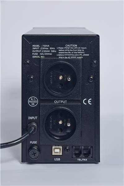 Počet výstupních zásuvek:2; Použití:Desktop; Provedení:Tower; Zdánlivý výkon VA:750; Topologie:Line-Interactive; Fáze (Vstup/Výstup):1:1; Komunikace:USB; Typ výstupu:FR; Ochrana telefonní sítě.