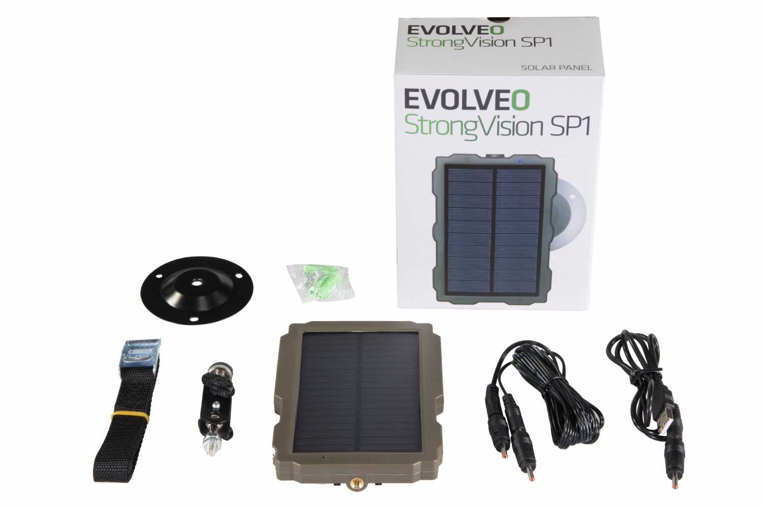 Solární panel určený pro napájení fotopastí EVOLVEO StrongVison. Solární panel obsahuje vestavěnou 1500mAh baterii, která slouží v době, kdy není dostatečný sluneční jas pro provoz připojených zařízení. U fotopastí EVOLVEO StrongVision nedochází k nabíjení baterií fotopasti, solární panel slouží v tomto případě jako nezávislý zdroj napájení a baterie fotopasti jako záložní zdroj napájení