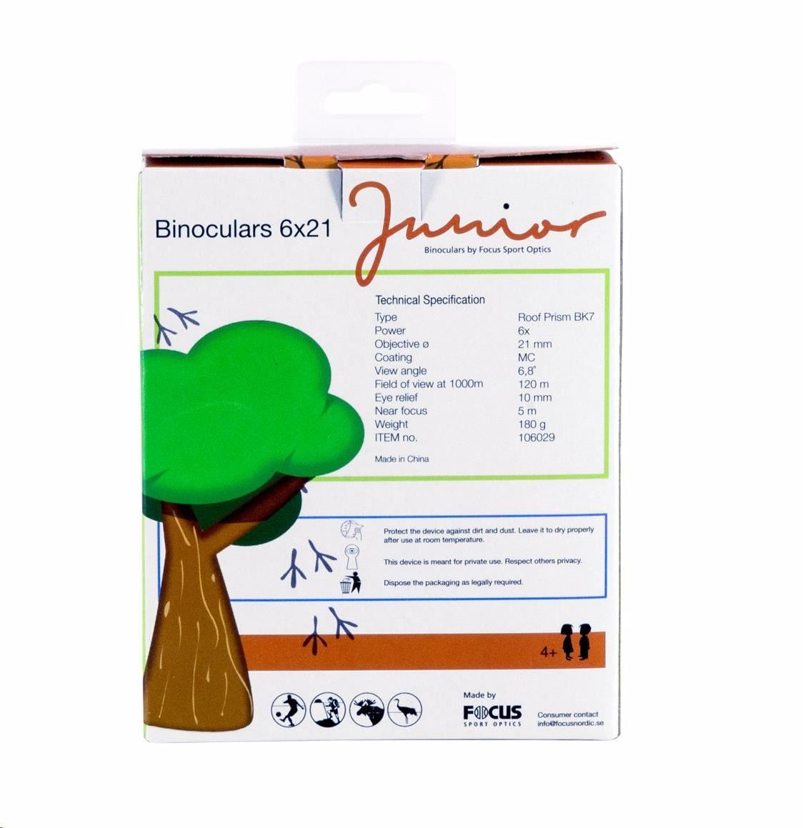 Focus Junior 6x21 je perfektní binokulární dalekohled, který nesmí chybět ve výbavě žádného malého pozorovatele. Výběr ze dvou barevných provedení ocení nejen chlapci, ale také dobrodružné dívky. Tento malý kapesní dalekohled je určen pro děti s rozpětím očí mezi 50 - 63 mm. Speciální konstrukce s jedním centrálním kloubem zajistí ideální stabilitu. Velké zaostřovací kolečko usnadňuje úpravu ostrosti a povrchová úprava optiky poskytuje jasný obraz. Kaučukové tělo je odolné proti nárazům a zároveň zajišťuje bezpečné a příjemné uchopení. Díky tomu se vyhnete nechtěným pádům z důvodu nepříjemného držení, což každý rodič ocení. Díky 6násobnému zvětšení dopřejete svým dětem možnost rychleji a snadněji spatřit ptáky nebo jiná zvířata, které děti jednoduše milují. Balení také obsahuje pouzdro na opasek, popruh na krk a čistící hadřík na optiku. Švédská značka Focus Sport Optics vyrábí optiku od roku 1985. Její produkty jsou ve Skandinávských zemích, kde je příroda nekompromisní, oblíbené díky skvělému poměru ceny a výkonu..