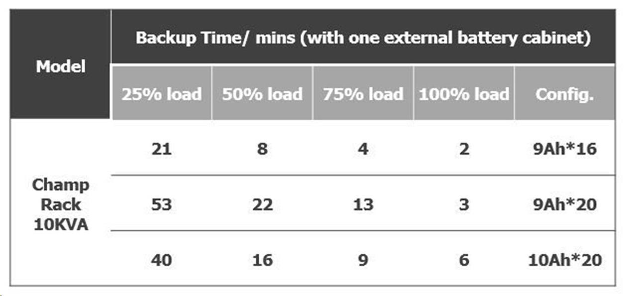 | Backup time - 1x Battery Bank (20pcs 9Ah) | |
