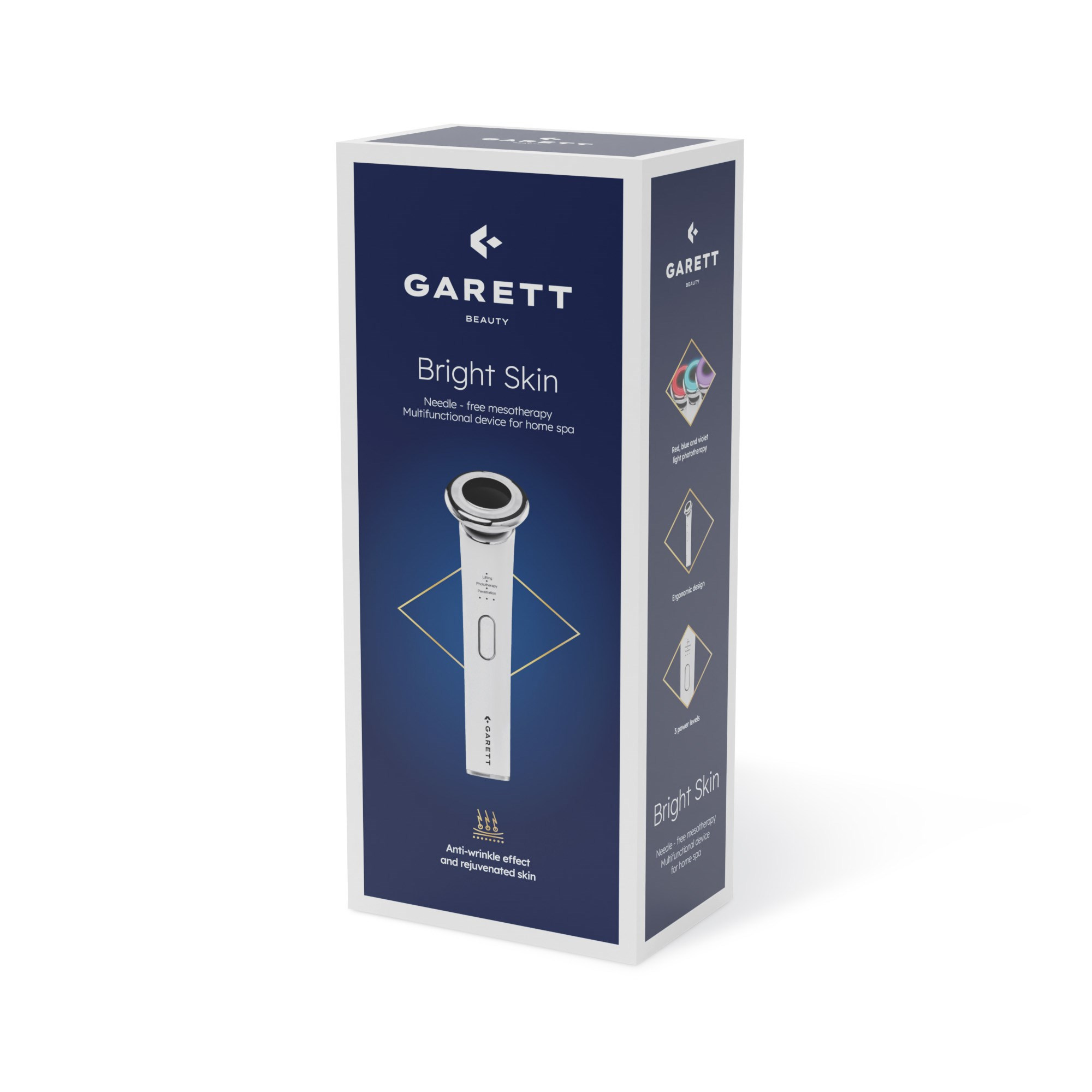 Garett Beauty Bright Skin bezjehličková mezoterapie je kosmetický přístroj, který kombinuje EMS, RF, LED a vibrace na omlazení, zpevnění a regeneraci pleti..
