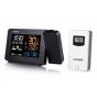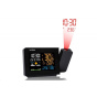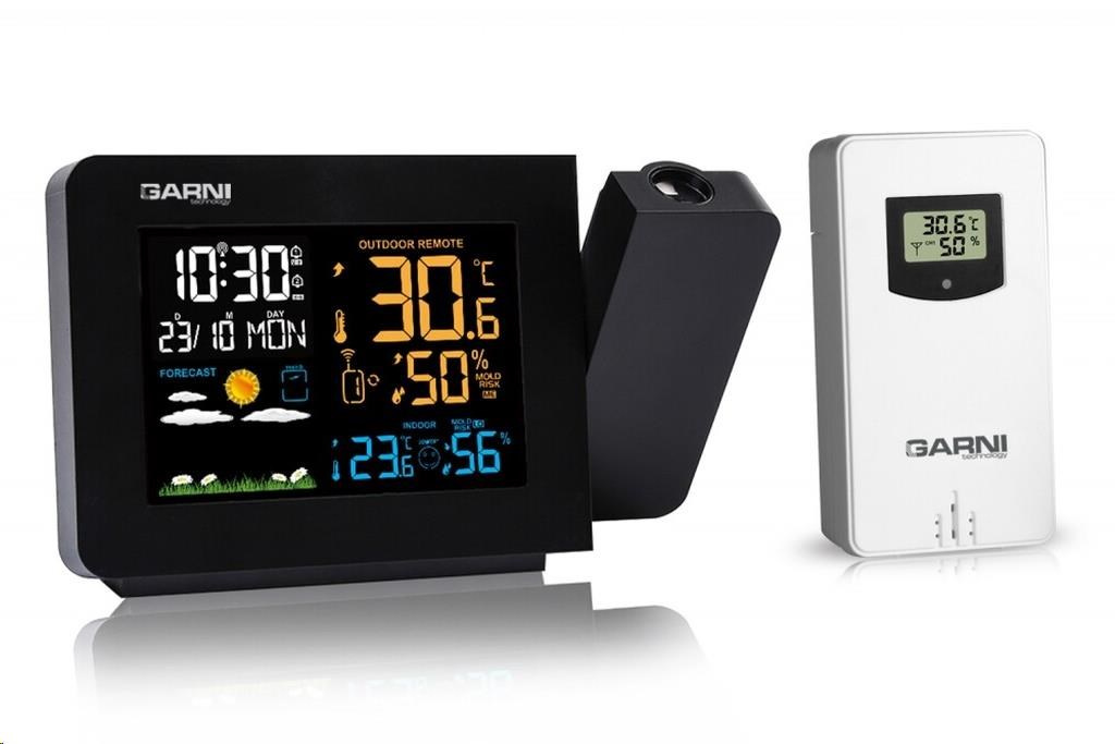Meteorologická stanice se špičkovým inverzním barevným VA displejem s časem řízeným rádiovým signálem DCF-77, budíkem, měřením vnitřní teploty a relativní vlhkosti, bezdrátovým čidlem pro měření vnější teploty a relativní vlhkosti a projekcí času a vnitřní / venkovní teploty inverzní barevný VA displej o rozměrech 94 x 63 mm s možností stálého osvětlení 3 stupně jasu osvětlení displeje, možnost vypnutí osvětlení displeje s možností krátkodobého osvětlení na 15 s velikost číslic na displeji – čas 13 mm, datum, zkratka názvu dne 7 mm, vnitřní teplota a relativní vlhkost 10 mm, vnější teplota 20,5 mm, vnější relativní vlhkost 13 mm čas a datum řízené signálem DCF-77 s možností manuálního nastavení ikona příjmu signálu DCF-77 zkratka názvu dne 12ti, nebo 24 hodinový formát zobrazení času možnost nastavení časového pásma od -12 do +12 hodin budík s 2 budícími časy s funkcí opakovaného buzení (Snooze) nastavitelné od 5 do 60 minut budící signál - 10 sekund 1 pípnutí za sekundu, 10 sekund 2 pípnutí za sekundu, 10 sekund 3 pípnutí za sekundu a poté stále 4 pípnutí za sekundu střídavá projekce času a vnitřní a vnější teploty (teploty se střídají co 5 s) s možností otočení obrazu o 180°, možnost sklopení tubusu projektoru o 90° dopředu a dozadu barva projekce červená 2 stupně jasu a možnost vypnutí projekce 6 animovaných ikon předpovědi počasí (slunečno, polojasno, oblačno, srážky, silný déšť a sněžení) na základě sledování barometrického tlaku vestavěným barometrickým čidlem možnost nastavení výchozí ikony předpovědi počasí zobrazení hodnot vnitřní a vnější teploty a relativní vlhkosti paměť na maximální a minimální naměřené hodnoty teploty a rel. vlhkosti s automatickým mazáním v 0:00 hodin šipky tendence vývoje barometrického tlaku, vnitřní a vnější teploty a rel. vlhkosti 3 stupně indikace stavu vnitřní a vnější relativní vlhkosti indikace námrazy vnější teploty v rozsahu od -1°C do +3°C ikonou na displeji zobrazení teploty ve °C, nebo °F zobrazení hodnoty venkovního rosného bodu a teplotního indexu pro každý kanál možnost použití až 3 bezdrátových čidel GARNI 30H (jedno čidlo GARNI 030H je součástí dodávky) funkce automatického přepínání kanálů 5 ikon vnitřní tepelné pohody bezdrátový přenos hodnot vnější teploty a relativní vlhkosti na frekvenci 433 MHz ikona příjmu signálu bezdrátového čidla ikony slabých baterií napájení síťovým adaptérem a záložními bateriemi možnost postavení barva černá Bezdrátové čidlo GARNI 030H vlhkosti odolné displej o rozměrech 19 x 11 mm velikost číslic na displeji: teplota a relativní vlhkost 4 mm měření teploty a relativní vlhkosti 3 kanály maximální RF výkon 10 dBm (10 mW) možnost postavení a zavěšení barva bílá Obsah balení: 1 x hlavní jednotka GARNI 439 Line 1 x bezdrátové čidlo GARNI 030H 1 x síťový adaptér český, slovenský, německý, anglický, italský, polský a maďarský návod.