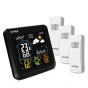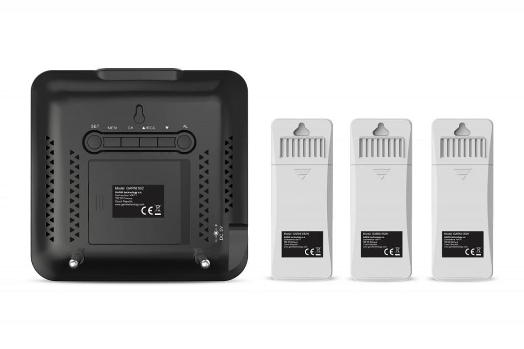 Meteorologická stanice se 3 bezdrátovými čidly pro měření vnější teploty a relativní vlhkosti, špičkovým inverzním barevným VA displejem s časem a datem řízenými rádiovým signálem DCF-77, budíkem, grafem, měřením vnitřní teploty, relativní vlhkosti a absolutního a relativního barometrického tlaku. Zobrazení všech měřených hodnot na displeji současně. špičkový inverzní barevný VA displej o rozměrech 106 x 94 mm s možností stálého osvětlení při napájení síťovým adaptérem, nebo krátkodobým osvětlením na 10 s při napájení bateriemi tři stupně jasu osvětlení displeje (při napájení síťovým adaptérem) a možnost vypnutí osvětlení displeje velikost číslic na displeji – čas, datum 7 mm, vnitřní teplota 21 mm, vnitřní relativní vlhkost 14 mm, vnější teplota 12,5 mm, vnější relativní vlhkost 10 mm, barometrický tlak 4,5 mm barvy na displeji: čas, barometrický tlak, vnitřní teplota a rel. vlhkost, graf bílá, teplota a rel. vlhkost na kanálu č.1 žlutá, na kanálu č.2 zelená a na kanálu č.3 oranžová čas a datum řízené signálem DCF-77 s možností manuálního nastavení ikona příjmu signálu DCF-77 12ti, nebo 24 hodinový formát zobrazení času možnost nastavení časového pásma od -12 do +12 hodin budík s funkcí opakovaného buzení (Snooze) po 5 minutách budící signál - 10 sekund 1 pípnutí za sekundu, 10 sekund 2 pípnutí za sekundu, 10 sekund 4 pípnutí za sekundu a poté stálé pípání 5 ikon předpovědi počasí (jasno, polojasno, oblačno, srážky (déšť), srážky (sněžení) na základě sledování barometrického tlaku vestavěným barometrickým čidlem možnost nastavení výchozí ikony předpovědi počasí zobrazení hodnot vnitřní a vnější teploty a relativní vlhkosti ze všech 3 čidel současně zobrazení teploty ve °C, nebo °F zobrazení barometrického tlaku absolutního a relativního (hPa/mb nebo mmHg) možnost nastavení hodnoty relativního barometrického tlaku graf vývoje bar. tlaku, vnitřní a vnější teploty na všech třech kanálech za uplynulých 12 hodin paměť na maximální a minimální naměřené hodnoty teploty a rel. vlhkosti 3 ikony vnitřní tepelné pohody 3 bezdrátová čidla GARNI 052H jsou součástí balení bezdrátový přenos hodnot vnější teploty relativní vlhkosti na frekvenci 433 MHz ikona slabých baterií hlavní jednotky a venkovních čidel napájení hlavní jednotky síťovým adaptérem nebo bateriemi délka kabelu síťového adaptéru 1,80 m možnost postavení, nebo zavěšení barva černá Bezdrátové čidlo GARNI 052H vlhkosti odolné displej o rozměrech 25 x 12 mm velikost číslic na displeji: teplota 7 mm a relativní vlhkost 6 mm měření teploty a relativní vlhkosti 3 kanály maximální RF výkon 10 dBm (10 mW) možnost postavení, nebo zavěšení barva bílá Obsah balení: 1 x hlavní jednotka GARNI 502 3 x bezdrátové čidlo GARNI 052H 1 x síťový adaptér český, slovenský, německý, anglický, polský, maďarský a nizozemský návod.