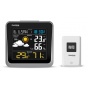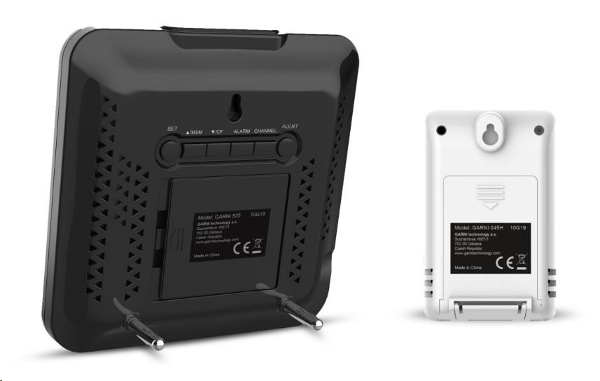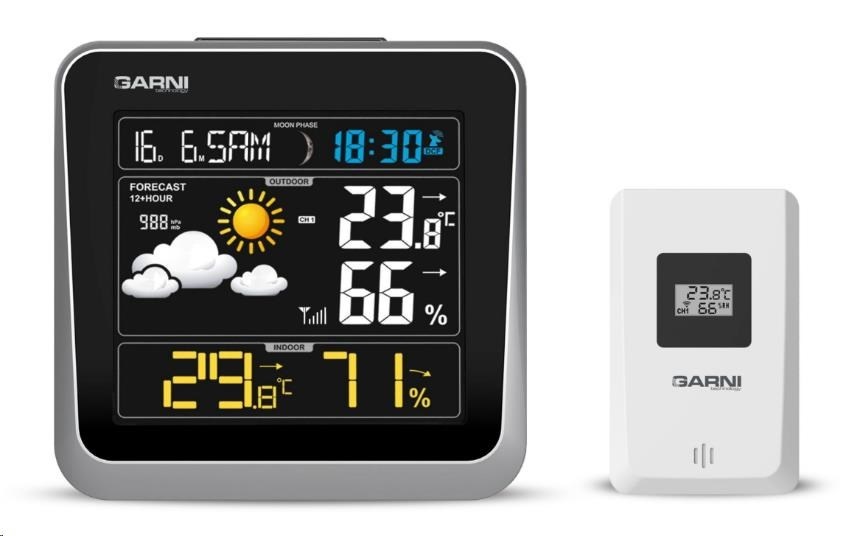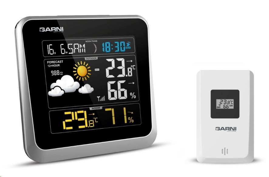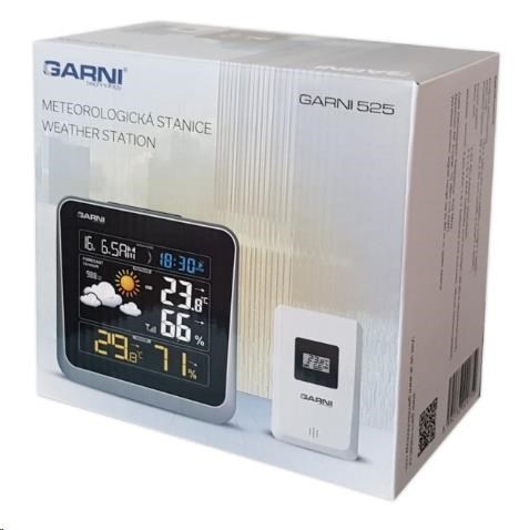 Meteorologická stanice se špičkovým inverzním barevným VA displejem s časem a datem řízenými rádiovým signálem DCF-77, budíkem, měřením vnitřní teploty, relativní vlhkosti a absolutního barometrického tlaku a bezdrátovým čidlem pro měření vnější teploty a relativní vlhkosti. - špičkový inverzní barevný VA displej o rozměrech 106 x 94 mm s možností stálého osvětlení při napájení síťovým adaptérem, nebo krátkodobým osvětlením na 10 s při napájení bateriemi - tři stupně jasu osvětlení displeje (při napájení síťovým adaptérem) - velikost číslic na displeji – čas, datum a zkratka názvu dne 10 mm, vnitřní teplota a relativní vlhkost - 17 mm, vnější teplota a relativní vlhkost 19 mm, barometrický tlak 4,5 mm - čas a datum řízené signálem DCF-77 s možností manuálního nastavení - ikona příjmu signálu DCF-77 - 12ti, nebo 24 hodinový formát zobrazení času - možnost nastavení časového pásma od -12 do +12 hodin - budík pro buzení každý den, nebo v pracovní dny s funkcí opakovaného buzení (Snooze) po 5 minutách - budící signál - 10 sekund 1 pípnutí za sekundu, 10 sekund 2 pípnutí za sekundu, 10 sekund 4 pípnutí za sekundu a poté stálé pípání - 6 ikon předpovědi počasí (jasno, polojasno, oblačno, srážky (déšť), srážky (sněžení), přívalové srážky) na základě sledování barometrického tlaku vestavěným barometrickým čidlem - zobrazení hodnot vnitřní a vnější teploty a relativní vlhkosti - šipky vývoje teploty, relativní vlhkosti - alarm horní a dolní meze venkovní teploty v rozsahu od -40°C do +70°C a to pro každý kanál zvlášť. - měření absolutního barometrického tlaku (hPa/mb nebo mmHg) - zobrazení teploty ve °C, nebo °F - paměť na maximální a minimální naměřené hodnoty teploty a rel. vlhkosti s automatickým nulováním ve 0:00 hodin - možnost použití až 3 bezdrátových čidel GARNI 045H (jedno čidlo je součástí dodávky) - funkce automatického přepínání kanálů na kterých jsou bezdrátová čidla přihlášená po 5 s - bezdrátový přenos hodnot vnější teploty relativní vlhkosti na frekvenci 433 MHz - zobrazení fáze Měsíce - ikona slabých baterií hlavní jednotky a venkovního čidla - napájení hlavní jednotky síťovým adaptérem nebo bateriemi - délka kabelu síťového adaptéru 1,75 m - možnost postavení, nebo zavěšení - barva černá se stříbrným rámečkem Bezdrátové čidlo GARNI 045H - displej o rozměrech 18 x 10 mm - velikost číslic na displeji: teplota 4 mm a relativní vlhkost 3,5 mm - měření teploty a relativní vlhkosti - možnost postavení, nebo zavěšení - barva bílá Obsah balení: 1 x hlavní jednotka GARNI 525 1 x bezdrátové čidlo GARNI 045H 1 x síťový adaptér český, slovenský, německý, anglický, polský, maďarský a italský návod.