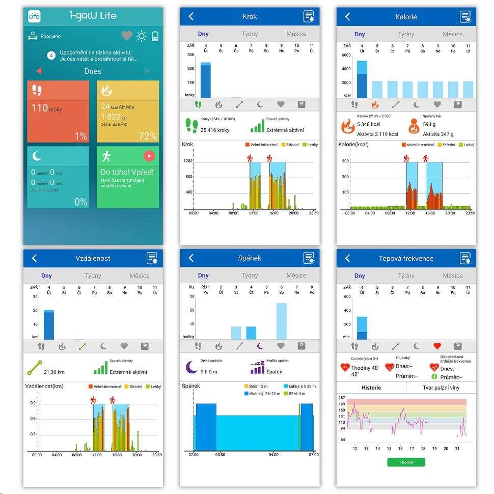 - zobrazení na náramku - datum, průběh plnění stanovených cílů, stav baterie, ikona aktuálního režimu, ikona zapnutého buzení, ikona připojení k mobilnímu zařízení aktuální čas, počet kroků, kalorie, tepová frekvence a dále ve sportovním režimu podle volby v aplikaci, až 8 zvolených údajů