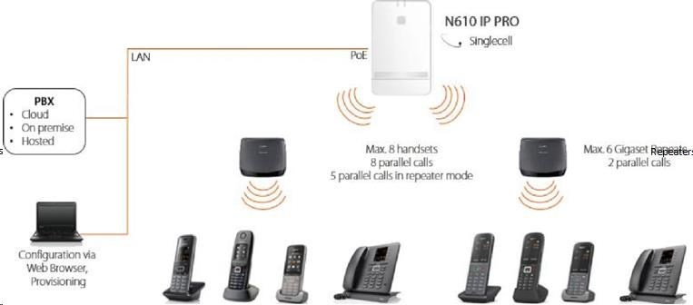 The Gigaset N610 IP PRO is the choice for cordless telephony convenience for up to 8 users. Up to 8 parallel calls guarantee a high degree of readiness in your business environment. Calls are secure due to SRTP and TLS. Contacts are always at hand on N610's central phonebook, or can be connected via LDAP, XML. With possibility to create own xhtml applications, users can access and control data relevant for business tasks. N610 is compatible to a large number of on-premise and cloud PBXs and easy to setup by autoprovisioning. It can be extended by up to 6 Gigaset repeaters to reach a larger DECT coverage area.