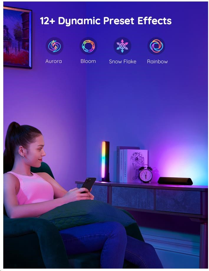 Govee Flow Plus nabízí 12 režimů pro dokonalé naladění světelné atmosféry. Govee technologie RGBICWW umí zobrazit až 57 barev najednou z celkové škály 16 milionů barev při intenzitě 1-100%. Může se také pochlubit živostností až 50.000 hodin. Barevnou teplotu lze nastavovat v rozmezí 2200-6500 K.