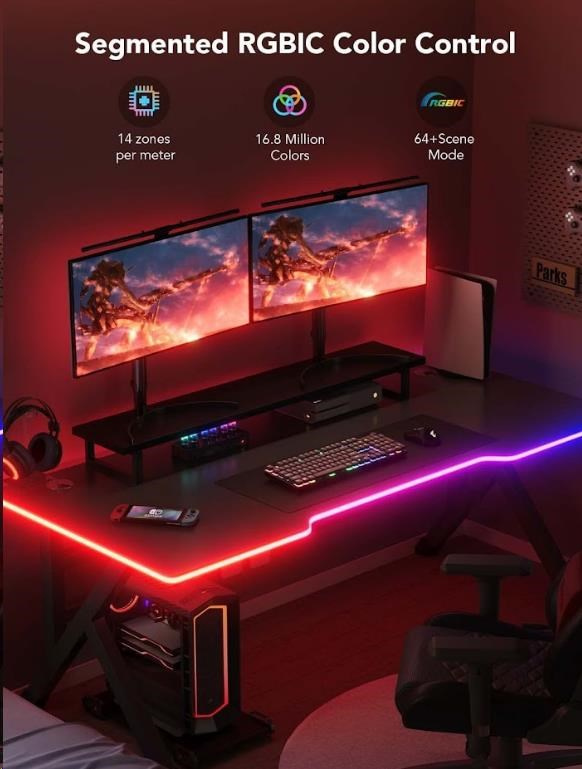 Vylepšete své herní, filmové a hudební zážitky s designovým tvarovatelným světelným páskem na psací stůl - Govee Neon Gaming Table Light. Je energeticky úsporný s životností až 50.000 hodin. Díky technologii RGBIC zobrazuje tento neonový světelný pásek až 57 barev najednou a celkově umí zobrazit až 16 milionů barev s intenzitou v rozmezí 1-100%. Určitě si vyberete z více než 64 režimů osvětlení a při poslouchaní oblíbené hudby si můžete zvolit také z 11 rytmických režimů. Světla se ovládají hlasem přes Siri, Amazon Alexa nebo Google Assistant nebo přes aplikaci Govee Home na vašem chytrém telefonu/tabletu. Světelný pásek má celkovou délku 3 metry, je určen na instalaci na různé typy stolů a jeho tvar si můžete přizpůsobit podle vlastní fantazie. Instalace je velmi jednoduchá bez vrtání pomocí 3M pásek.