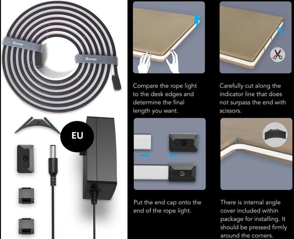 Instalace je velice jednoduchá pomocí 3M pásek. Govee Neon je pružný a ohebný pásek, který můžete tvarovat podle tvaru svého stolu. V balení jsou také svorky pro instalaci na stůl ve tvaru L nebo s pravými úhly. Celková délka je 3 metry a na pásku jsou značky, kde lze pásek zkrátit jednoduchým přestřihnutím pásku. Nestříhejte pásek mimo označené body k tomu určené, poškodíte tím kontakty a pásek.
