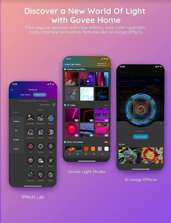 Spravujte nastavení barev a intenzity světla jednoduše pomocí aplikace Govee Home. Aplikace je zdarma ke stažení v Google Play a AppStore. Navíc získáte přístup k funkci časovače, DIY barvám, režimu videa, synchronizaci hudby a režimům scény. Rovněž si můžete pomocí časovače nastavit automatické vypnutí a zapnutí, třeba podle doby usínání a vstávaní. Ovládání hlasem je možné přes Siri, Amazon Alexa a Google Assistant.