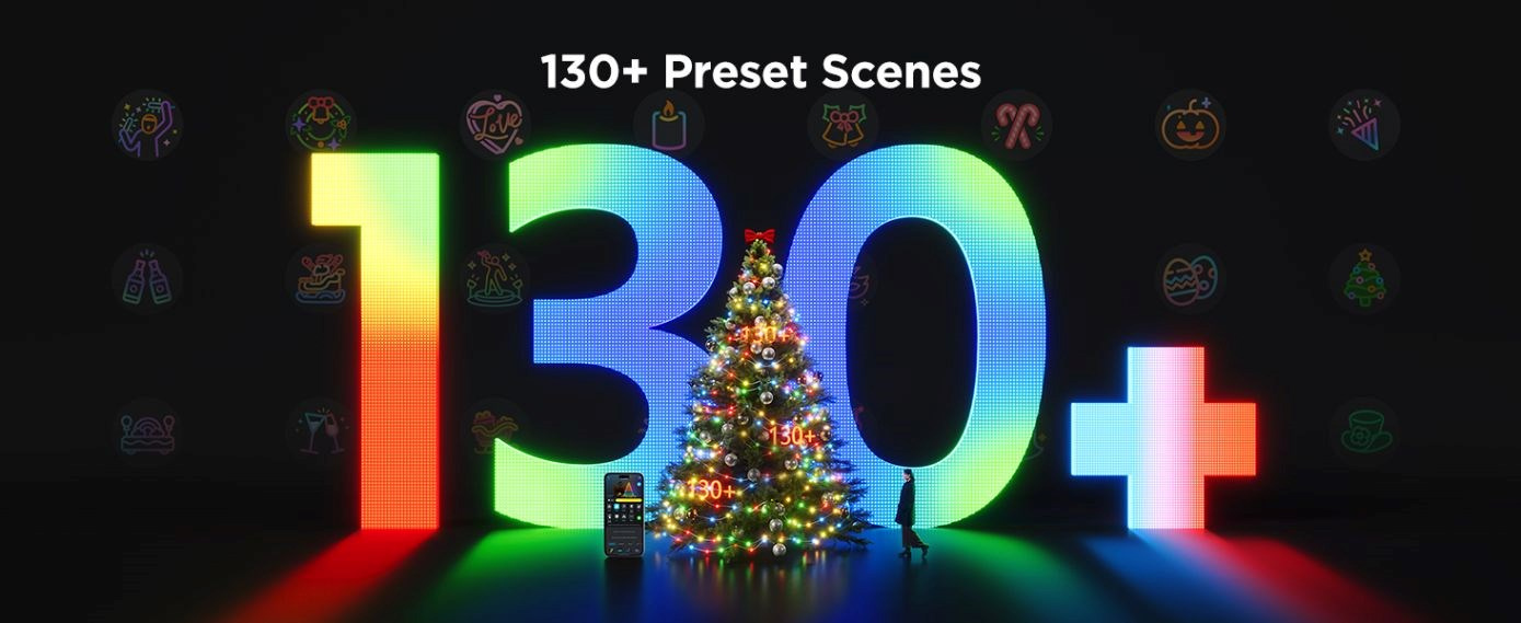 Govee Vánoční světelný řetěz nabízí více než 130 přednastavených světelných scén, které jsou perfektní pro vánoční sezónu i další festivaly během roku. Tyto scénické režimy zahrnují pestrou škálu efektů, od tradičních a útulných atmosfér po živé a energické barevné kombinace, které dokáží oživit jakoukoli oslavu. Ať už slavíte Vánoce, Nový rok, Halloween nebo jiné speciální příležitosti, vždy najdete tu pravou scénu, která dokonale ladí s vaší náladou a tématem události. S těmito bohatými možnostmi přizpůsobení se váš prostor stává centrem zábavy a radosti pro rodinu a přátele.