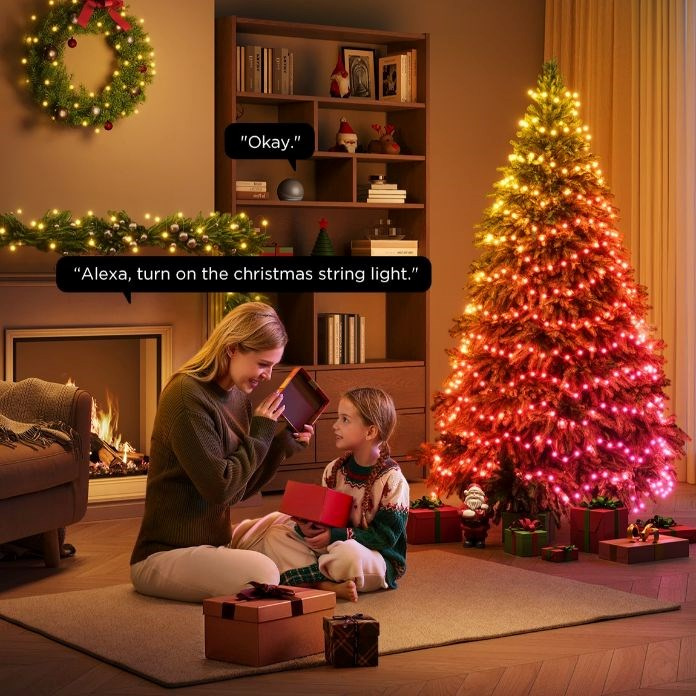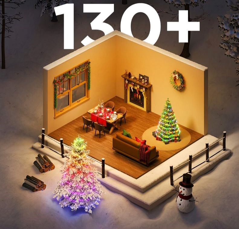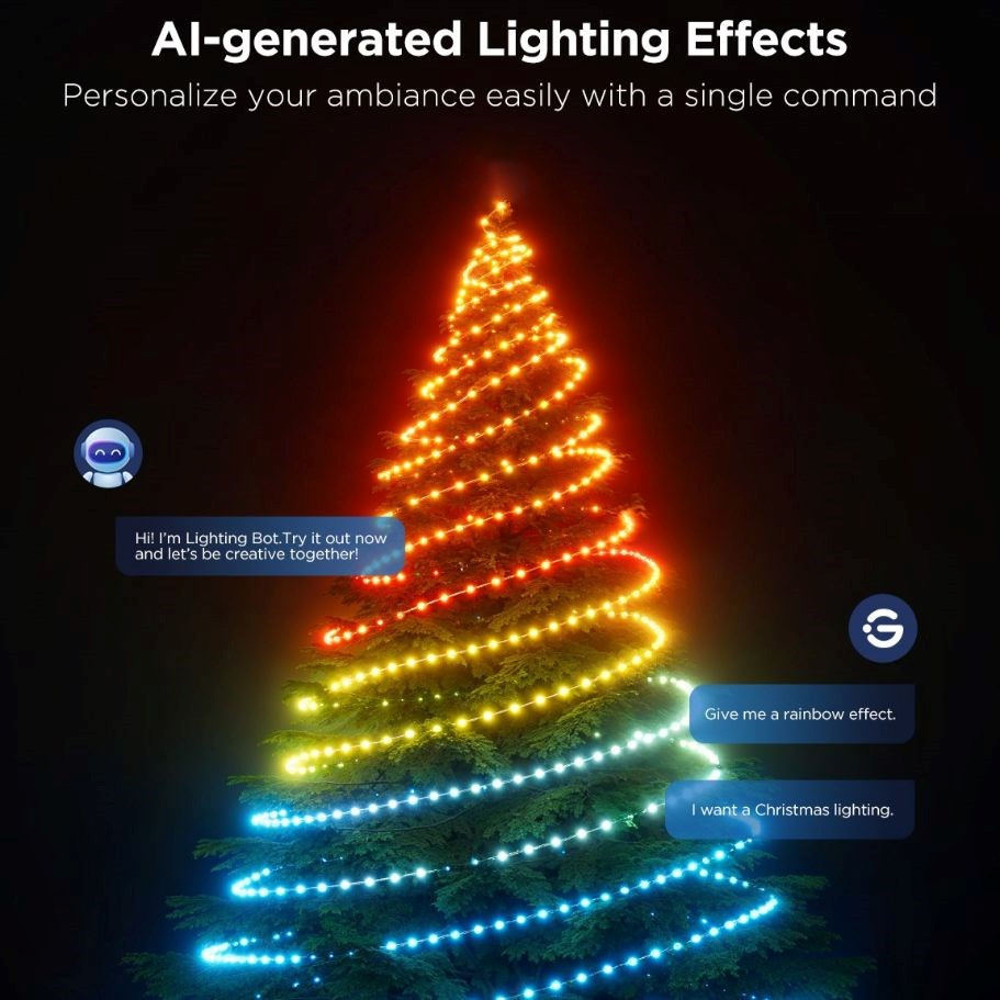 Govee Vánoční světelný řetěz o délce 20 metrů je ideální volbou pro všechny, kteří chtějí vytvořit dokonalou vánoční atmosféru doma i venku. Díky své délce pokryje tento řetěz větší plochy, ať už jde o vánoční stromek, plot, nebo jakoukoli jinou dekoraci. Vybavený pokročilou RGBICW technologií, umožňuje současně zobrazovat více barev na různých částech řetězu, což vytváří plynulé přechody a dynamické efekty, které vnesou do vašich svátečních dekorací život a kouzlo. Zásadní vlastností je možnost použití AI při generování vlastních scén pomocí hlasu, textu nebo obrázků.