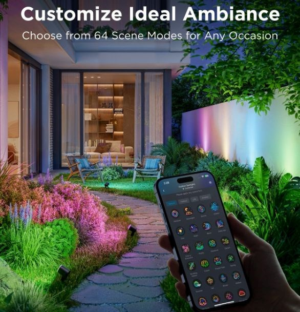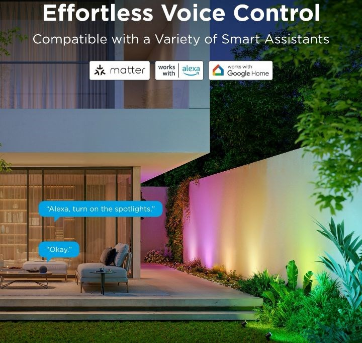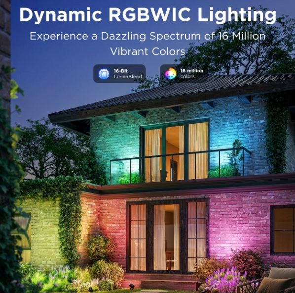 Úsporné zahradní reflektory se světelným výkonem 750 lm udělají z vaší zahrady designový skvost. Díky technologii RGBICWW umí zobrazit až 16 milionů barev a navíc nabídnou spektrum bílé od 2700 do 6500 K. Určitě si vyberete z více než 50 režimů osvětlení a při poslouchaní oblíbené hudby si můžete zvolit také ze 6 rytmických režimů. Nebo si prostě nastavte svoje vlastní barevné kombinace podle libosti na každém. Příkazy můžete zadat také hlasem přes Siri, Amazon Alexa nebo Google Assistant nebo přes aplikaci Govee Home na chytrém telefonu nebo tabletu. Nově světla podporují Matter, takže nativně podporují i Apple Homekit. Světlo má celkovou délku skoro 16 metrů a jeho instalace je velice jednouchá. Pomocí časovače můžete světla zapínat a vypínat automaticky podle západu a východu slunce. Světla mají index ochrany proti vodě IP67 (kromě zdrojového adaptéru) s provozní teplotou od -20°C do 40°C.