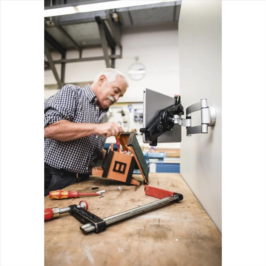 - držák tabletu pro rychlý a snadný přístup k zařízení - pro zařízení s uhlopříčkou 7"-11" (17,8-27,9 cm), výškou od 11 cm do 18 cm a šířkou od 19 cm do 28 cm - možnost otáčení pro individuální nastavení polohy zařízení - možnost naklopení nahoru/dolů - montáž na stěnu pomocí šroubů a hmoždinek - nastavitelné čelisti pro přizpůsobení konkrétnímu zařízení a bezpečné upevnění zařízení - vysoce kvalitní, stabilní, hliníkový držák s jednoduchým designem - vhodný pro kanceláře, kuchyně, dětské pokoje - maximální zatížení: 1 kg - materiál: hliník/ plast - barva: černá/ stříbrná - součástí balení je montážní materiál Obsah balení: - nástěnný držák na tablet - montážní materiál - návod k použití.