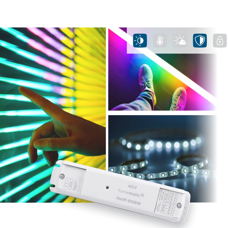 V závislosti na druhu LED pásku, umožňuje RGBW LED kontroler (HmIP-RGBW) vzdáleně zapínat/vypínat připojené světelné LED okruhy, měnit barvu scény a regulovat intenzitu jasu a barevnou teplotu.
