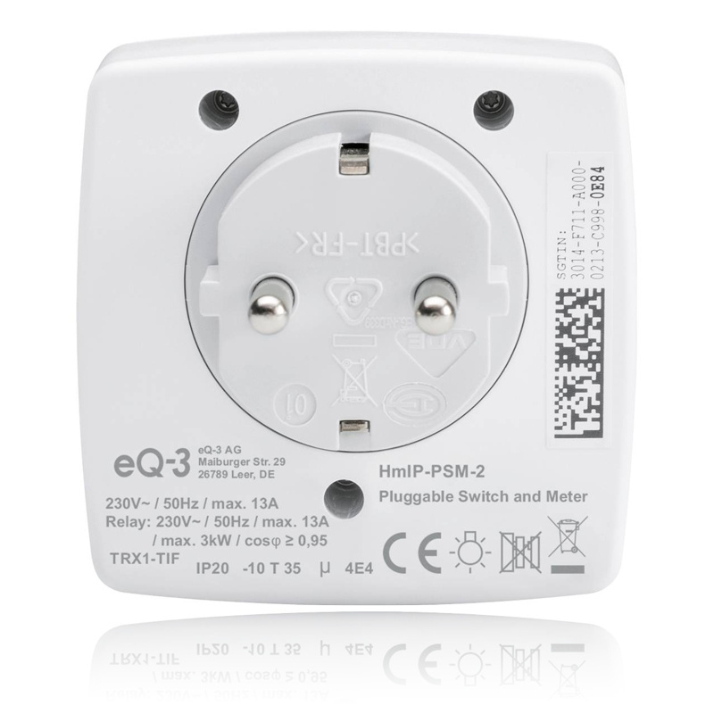 Spínaná bezdrátová zásuvka (HmIP-PSM-2) s funkcí měření umožňuje spínání připojených zařízení. Umožní spínat a vypínat připojené spotřebiče, měřit jejich spotřebu energie, napětí, proud a výkon. Připojená zařízení lze ovládat manuálně přímo tlačítkem na zásuvce nebo vzdáleně v kombinaci s Centrální jednotkou (HmIP-HAP) a mobilní aplikací Homematic IP.