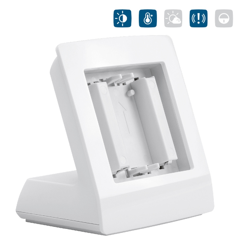 Pod krytem ve spodní části zařízení se nachází zásobník pro dva kusy tužkových napájecích baterií 1,5 V typu AA a stojánek tak může velmi dobře pracovat jako dokovací napájecí stanice i pro vložená zařízení bez napájecích baterií. Pokud je do Stojánku (HmIP-DS55) s bateriemi integrován bezdrátový bateriový prvek, bude navýšena pracovní doba této komponenty v důsledku použití baterií typu AA namísto běžně používaných baterií typu AAA přímo v zařízení.