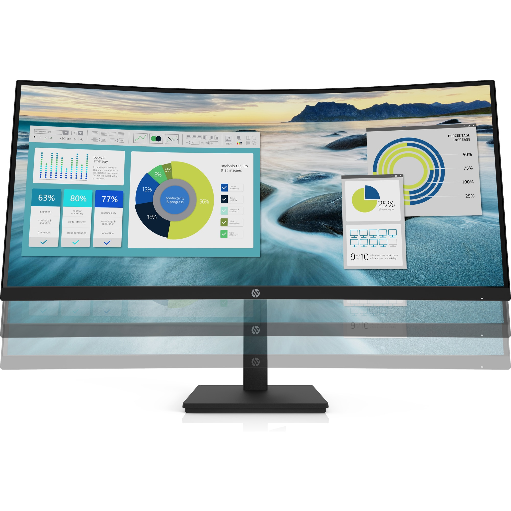 V případě prohnuté obrazovky P34hc WQHD platí, že větší znamená lepší. Ultraširoké obrazovky jsou opravdu podmanivé a zlepšují proto soustředění. Ve srovnání s menšími obrazovkami budete pozornější a až o 33 % produktivnější[1]..