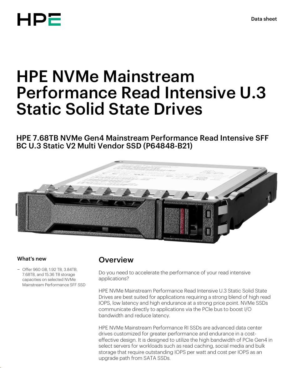 HPE 7.68TB NVMe Gen4 Mainstream Performance Read Intensive SFF BC U.3 Static V2 Multi Vendor SSD.