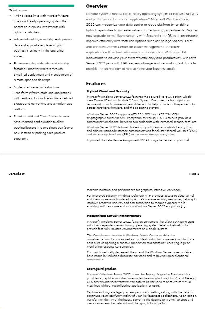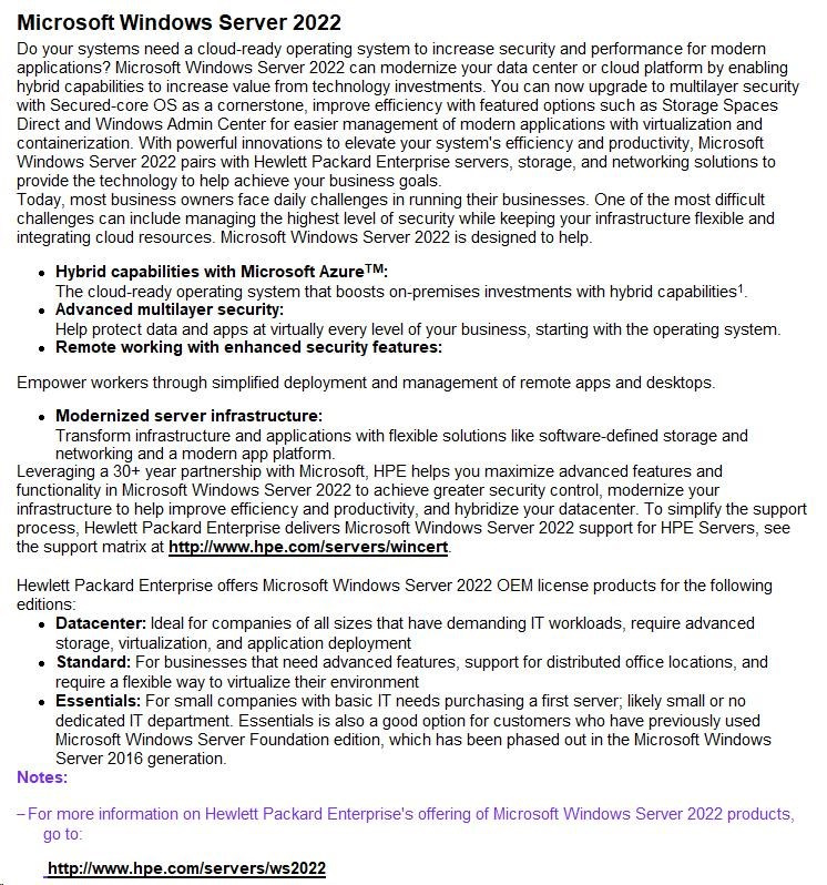 HPE Windows Server 2022 Datacenter Edition ROK 16Core No Reassignment Rights CZ EN PL RU SV