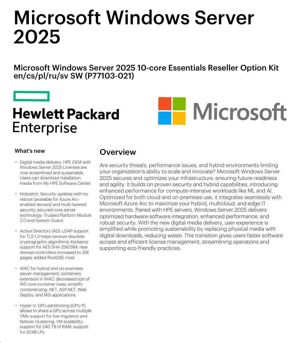 HPE Microsoft Windows Server 2025 10-core Essentials Reseller Option Kit CZ (25/50user/dev en/ru/po) OEM.