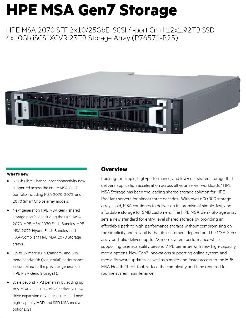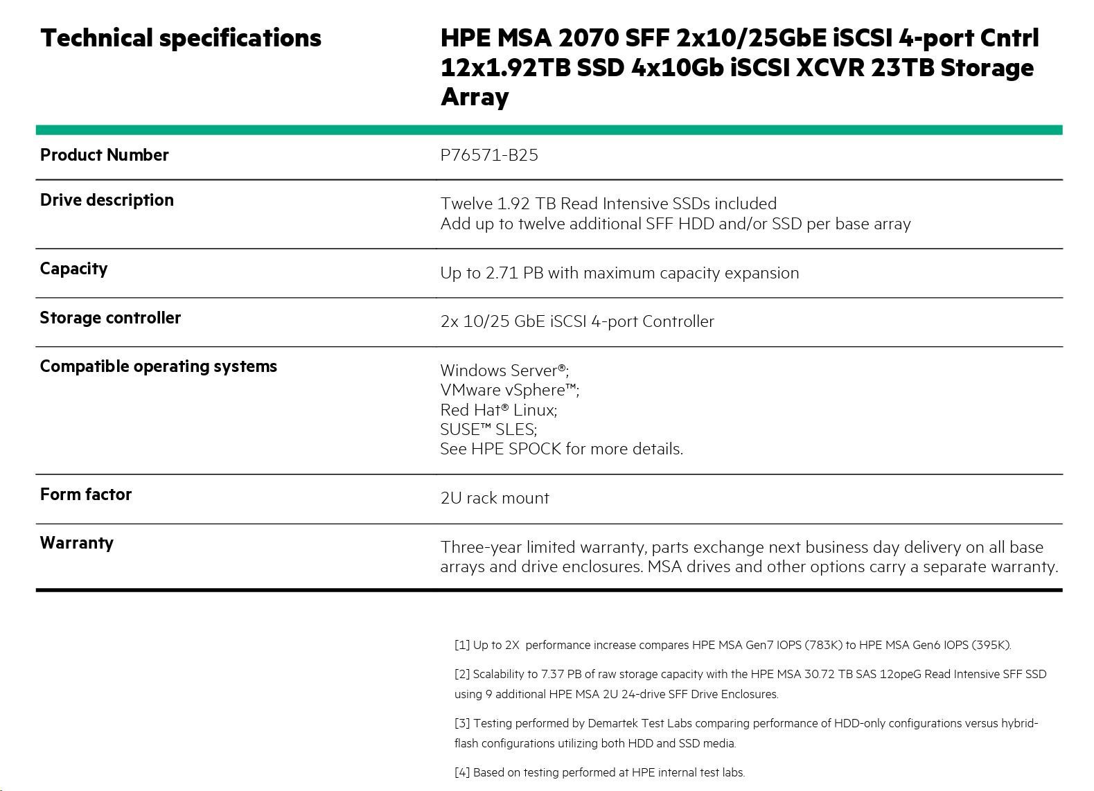 HPE MSA 2070 SFF 2x10/25GbE iSCSI 4-port Cntrl 12x1.92TB SSD 4x10Gb iSCSI XCVR 23TB Storage Array Smart Choice
